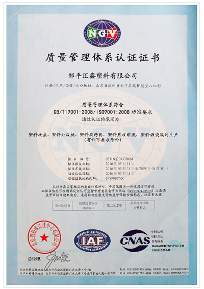匯鑫塑料質(zhì)量管理體系認(rèn)證證書